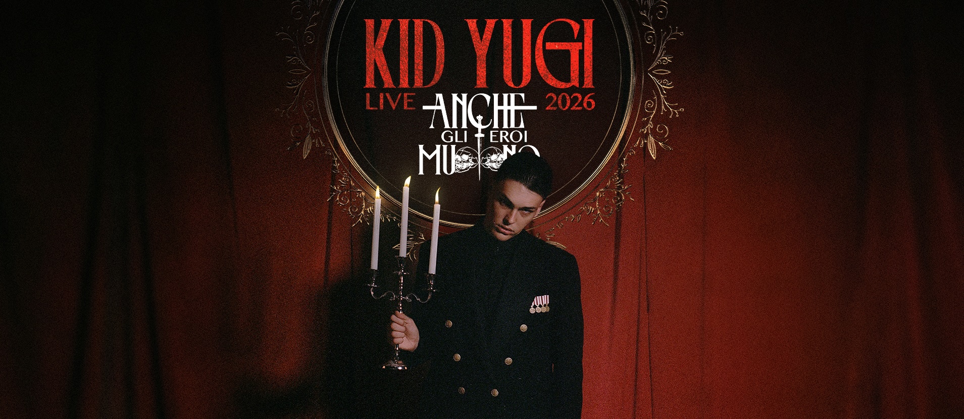 Kid Yugi, artista che sta rivoluzionando la scena rap italiana, protagonista assoluto di tutte le classifiche, a pochi giorni dalla certificazione disco di platino del suo ultimo album “Anche gli eroi muoiono”, annuncia “Anche Gli Eroi Muoiono Tour”, la sua prima tournée nei palasport delle principali città italiane. Nel suo ultimo lavoro discografico l’artista approfondisce i temi centrali della sua scrittura: il confine sottile tra bene e male, l’analisi della società contemporanea, la perdita dei valori assoluti e il concetto di eroe nell’epoca moderna. Il progetto nasce da una riflessione profonda sulla figura dell’idolo e sul valore attribuito alle persone oggi, spesso misurato in termini di successo e denaro. Kid Yugi porterà finalmente live sul palco tutte le sue più grandi hit e i nuovi brani contenuti nel nuovo album “Anche gli eroi muoiono”.